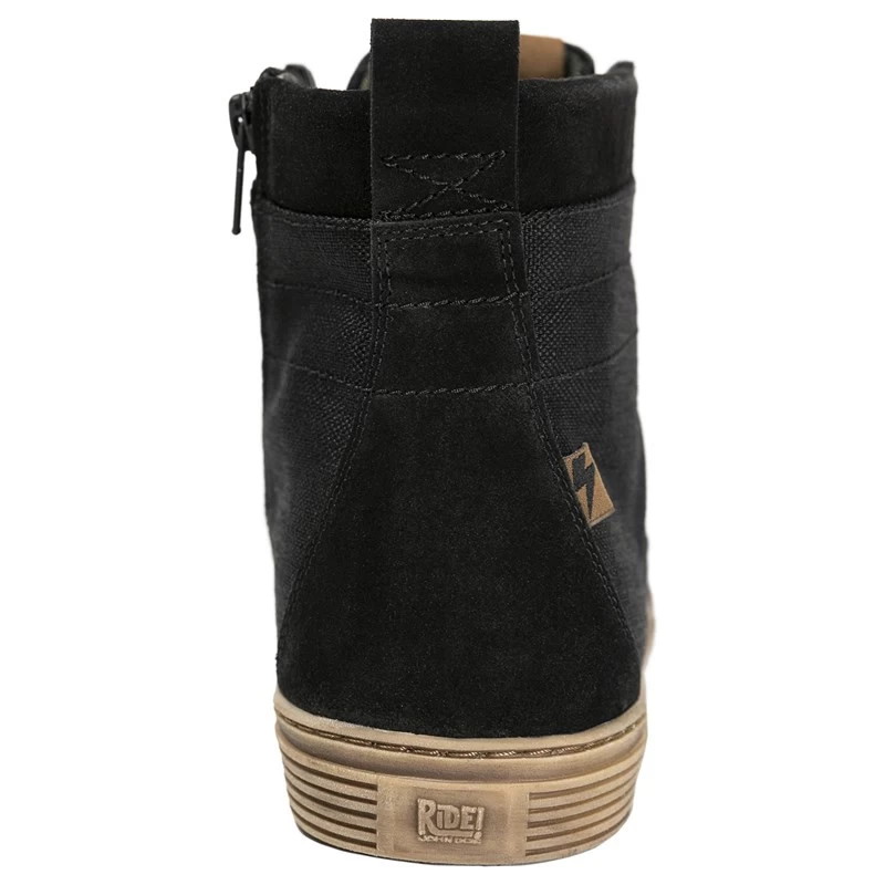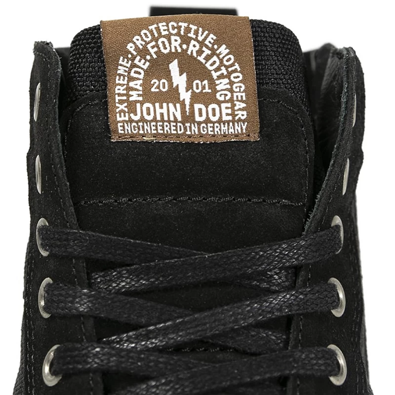 Er verfĂĽgt auch ĂĽber eine „Waterstopfunktion“ (bekannt von Trekking u. Wanderschuhen) d.h. die Schuhlasche ist so gefertigt, dass ein schnelles eindringen von Wasser im SchnĂĽrbereich des Schuhs nicht möglich ist. FĂĽr zusätzlichen Tragekomfort kann der Fahrer mittels einem „easy entry“ in der Innenseite des Stiefels per Reisverschluss diesen Stiefel schnell und einfach an- und ausziehen, ohne dabei die SchnĂĽrung öffnen zu mĂĽssen. Auch eine Ă–l resistente, vibrations absorbierende und rutschfeste Sohle gehört zur Standardausstattung der John Doe Motorradschuhe. Details wie ein Leder geprägtes John Doe Logo am Knöchelschutz oder das JDM-Metallemblem an der Einstiegslasche runden das klassische Design des Sneakers ab.