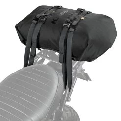 Der ROLLPACK lässt sich sicher und zusammengerollt auf dem Soziussitz oder einem Gepäckträger des Motorrads anbringen, wenn ein zusätzlicher Stauraum benötigt wird. Für eine schnelle und einfache Montage werden die mitgelieferten Schnallgurte um den Motorradrahmen geschlungen und am ROLLPACK befestigt.