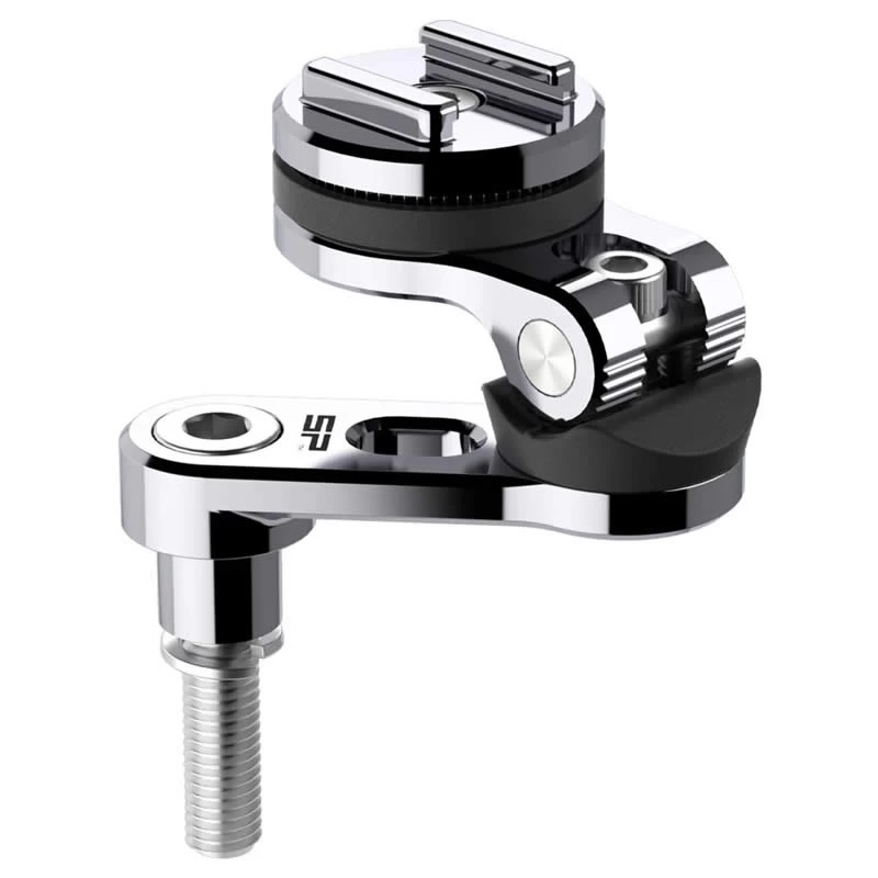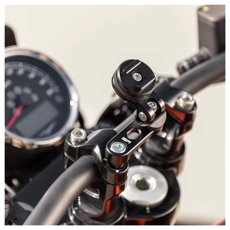 Schrauben Sie einfach die schlanke Aluminium-Halterung an die Lenkerklemme Ihres Motorrads und montieren Sie ein SP Connect™ PHONE CASE (oder UNIVERSAL INTERFACE), indem Sie es auf die Halterung setzen und um 90° im Uhrzeigersinn drehen.