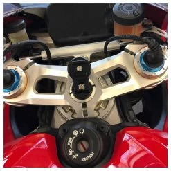 Schraube Sie einfach die schlanke Aluminiumhalterung in den Schaft Ihres Supersportlers. Ihr Mobiltelefon ist somit sicher in ihrem Sichtfeld positioniert.