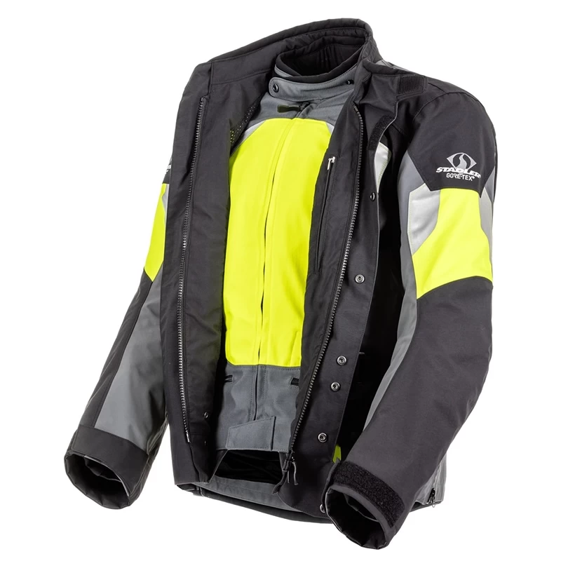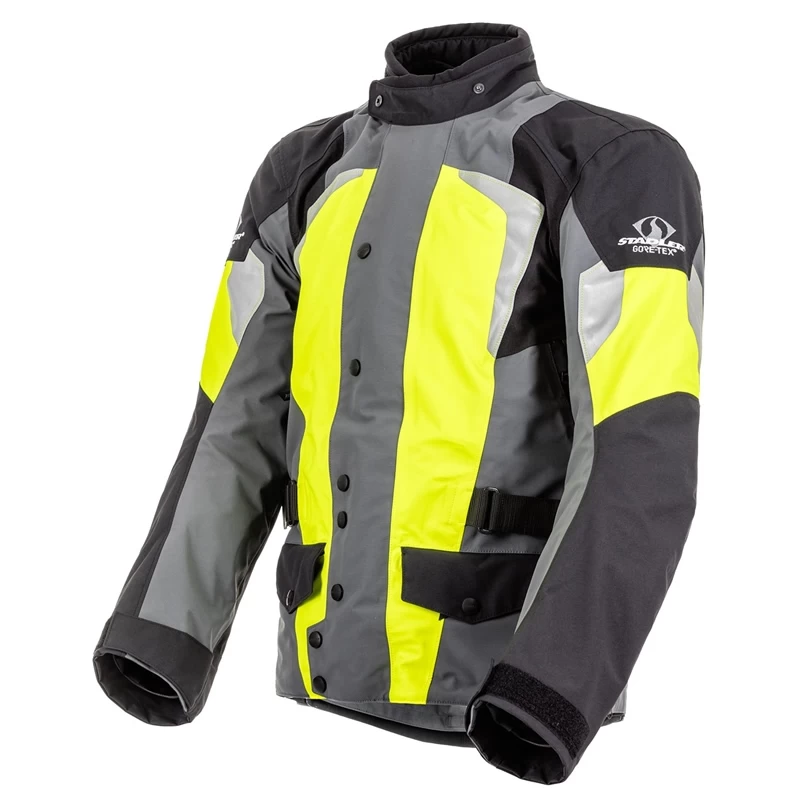 Die Stadler Textiljacke Sport Evo in grau-neongelb-schwarz ist eine wasserdichte Motorradjacke aus hochwertigem CORDURAÂź 500 mit Innenjacke die ideal im Sommer getragen werden kann.