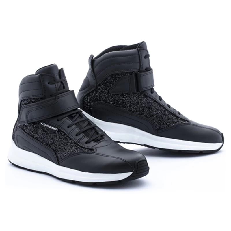 Gefertigt aus Wildleder gemischt mit technischem Gewebe, mit einem wasserdichten und atmungsaktiven Futter, mit dem beidseitigen Knöchelschutz aus PU, und der neu gestalteten Anti-Rutsch-Sohle ist der Audax-Motorradschuh sicher und angenehm zu tragen.