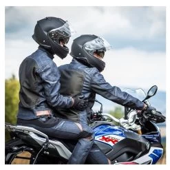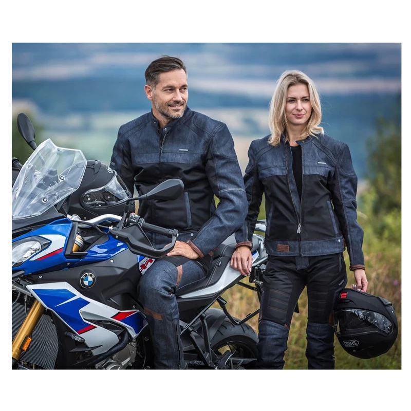 Die Kombination aus dunkelblauen Denim, schwarzem Mesh und braunem Leder gibt der Jacke einen einzigartigen Look. Die leichte und komfortable Jacke ist mit technischen Features einer Motorradjacke ausgestattet, die Schutz und Sicherheit während der Fahrt bietet. Kompatibel zu der Jacke ist die Airtech Hose.